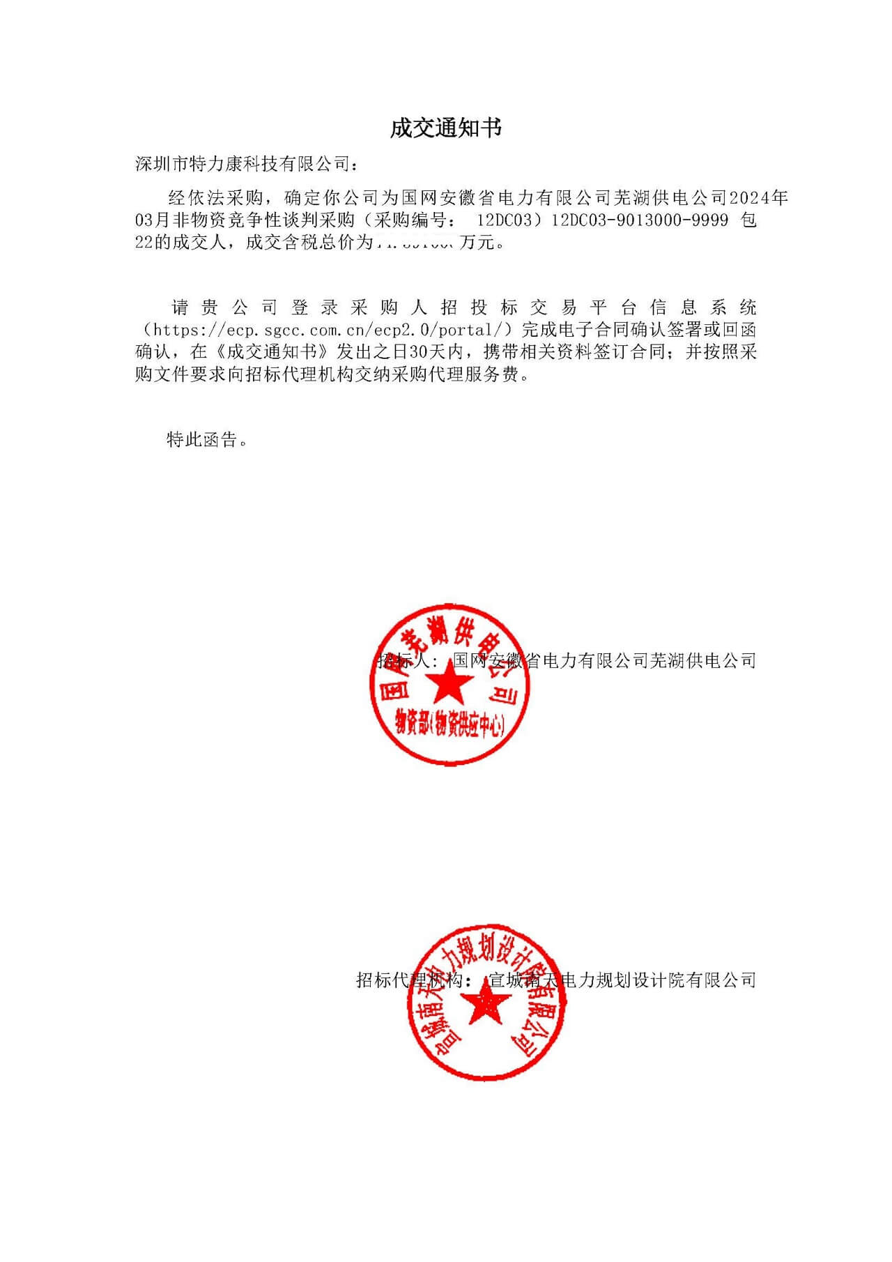2024年4月1日——深圳市特力康科技有限公司(以下簡稱“特力康”)近日成功中標國網安徽省電力有限公司蕪湖供電公司2024年3月非物資競爭性談判采購項目(采購編號:12DCO3)中的相關包件。